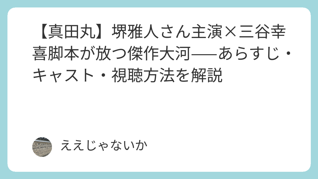 信州の小さな豪族に過ぎなかった真田家が、織田・徳川・北条・上杉という巨大勢力に囲まれながら、いかにして生き残ったのか——。「日の本一の兵(ひのもといちのつわもの)」と称えられた真田信繁(幸村)の生涯を、三谷幸喜さんらしいユーモアと鋭い人間洞察で描き出したエンターテインメント大河です。